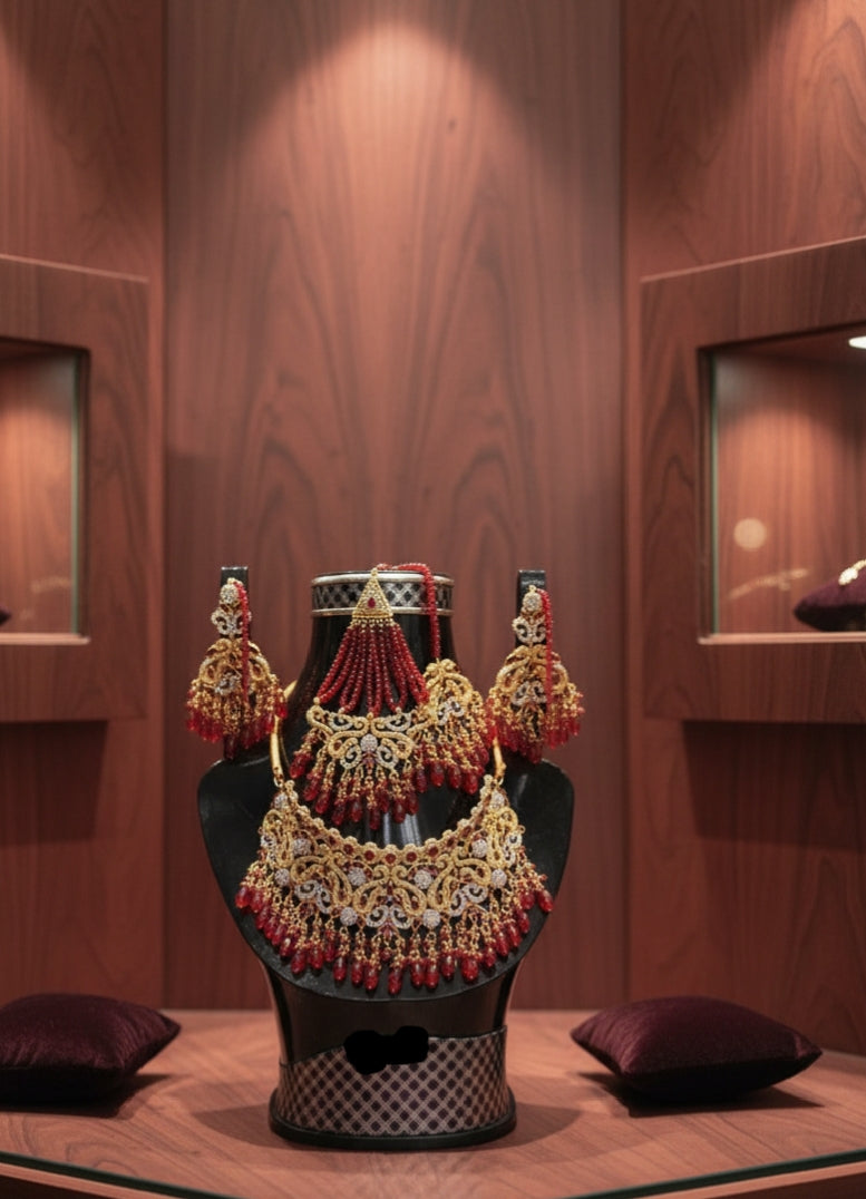 A fully detailed bridal jewelry set designed for a complete, regal wedding look. This set includes necklace, matching earrings, jhoomer, and bindi crafted with intricate detailing and high-quality stones. The design offers a traditional yet luxurious finish, perfect for brides who want an elegant and timeless appearance on their big day.